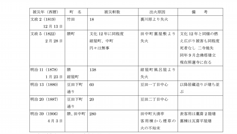 この検証に先立ち、隈・豆田地区の災害(特に火災)について検討する。記録に残るのは隈町の元禄6年(1693)に始まる以下表記の通り。(参照:田中晃著 隈町災害史より)