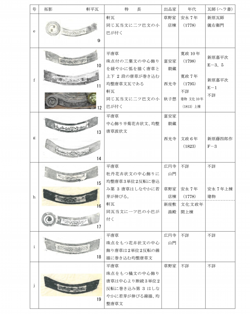 寛政年間に入ると、西光寺所蔵の平唐草(f-11(E-1)、E-2)鳥休伏間(カ)が「寛政7年(1795)」作で、富安家クンチョウ酒造の穀蔵平唐草(f-10、E-3、4、5)、軒丸瓦(ヌ)は「寛政10年(1798)」であるが、瓦師はいづれも「新原嘉平次」である。