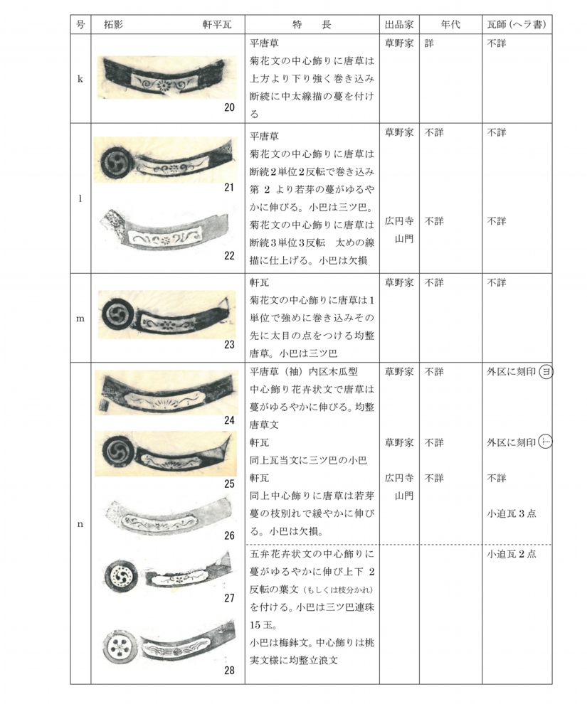 ここでは軒平瓦のうち、本葺型牝瓦を平唐草瓦、桟瓦葺型を唐草瓦と呼ぶが、昨今は一般に軒瓦と呼ばれるので軒瓦と区分表示する。また、軒丸瓦(巴瓦)と平唐草瓦のセット関係は多岐に渡り、それぞれの分類で検討した。