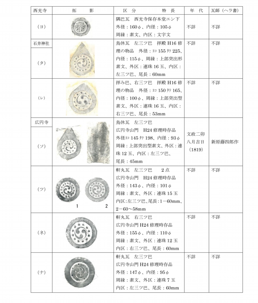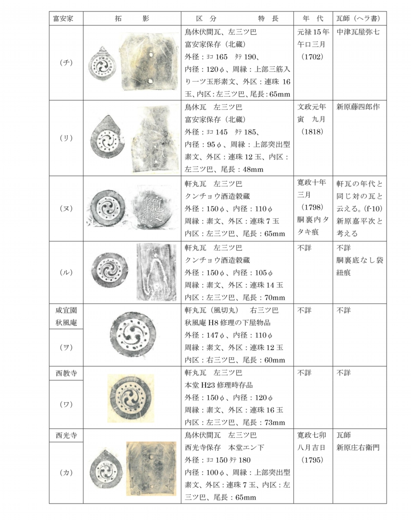 また、二ツ巴(e-9)は店棟で富安家穀蔵、安政9年のヘラ書きや西光寺所蔵の瓦当文と同一で