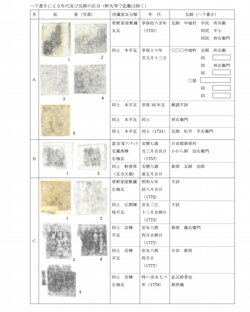 以上ヘラ書きを有する瓦が数多く発見されている。しかし現時点での発見は寺院や一部の豪商の邸宅 と土蔵が主で、一般民家からは見当たらない。寺院は建替えに於いても先代建物の鬼瓦や書留めのある 瓦は再用せず、保管している。豪商宅等に於いては建物の建築年代よりも古い時代の瓦が葺かれていた り、ストック保存されていたりする。建替え時に前の建物の瓦を再用したものと思える。特に(a・b・ c)や(チ)・(ル)の瓦等は現存建物の年代より古いが前述の通り前身の建物の瓦と考えるべきであろう。