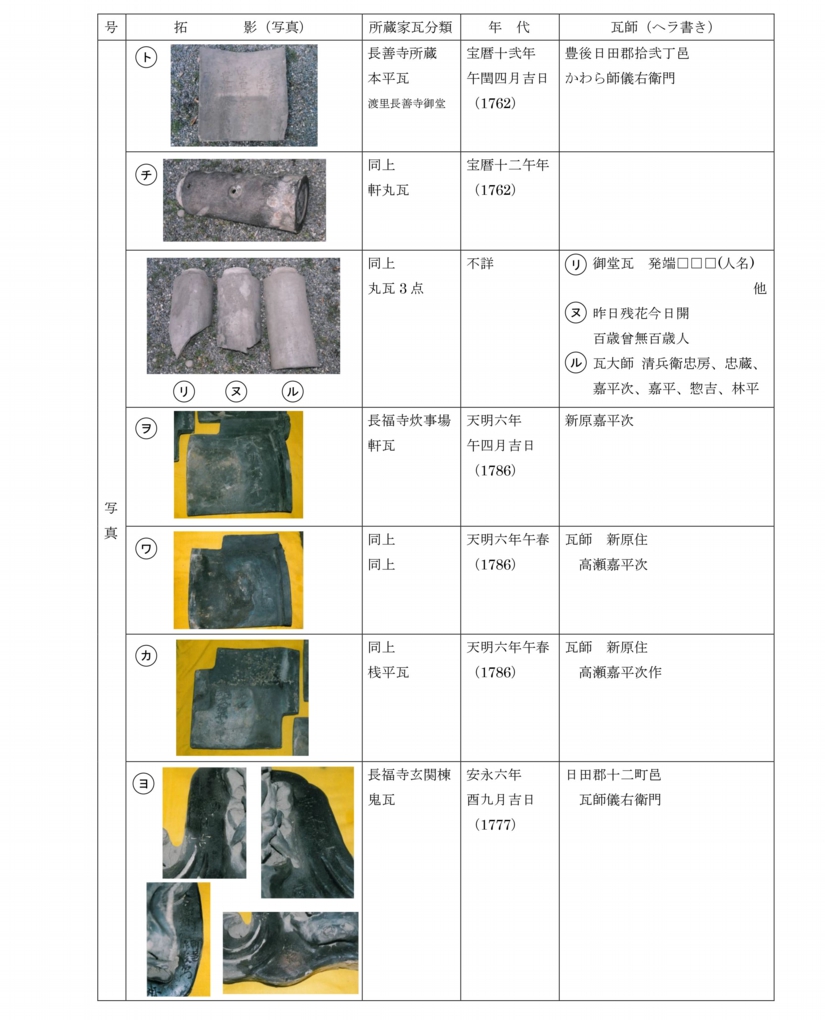 長福寺玄関棟の鬼瓦(写真 ヨ )は「安永6年(1777)日田郡十二町邑 瓦師儀右衛門」のヘラ書き、他に炊事場棟の軒瓦、桟平瓦等(写真 ヲ ・ ワ ・ カ )には「天明6年(1786)新原嘉平次 ヲ 、瓦師 新原住高瀬嘉平次」のヘラ書きの瓦が葺かれていた。