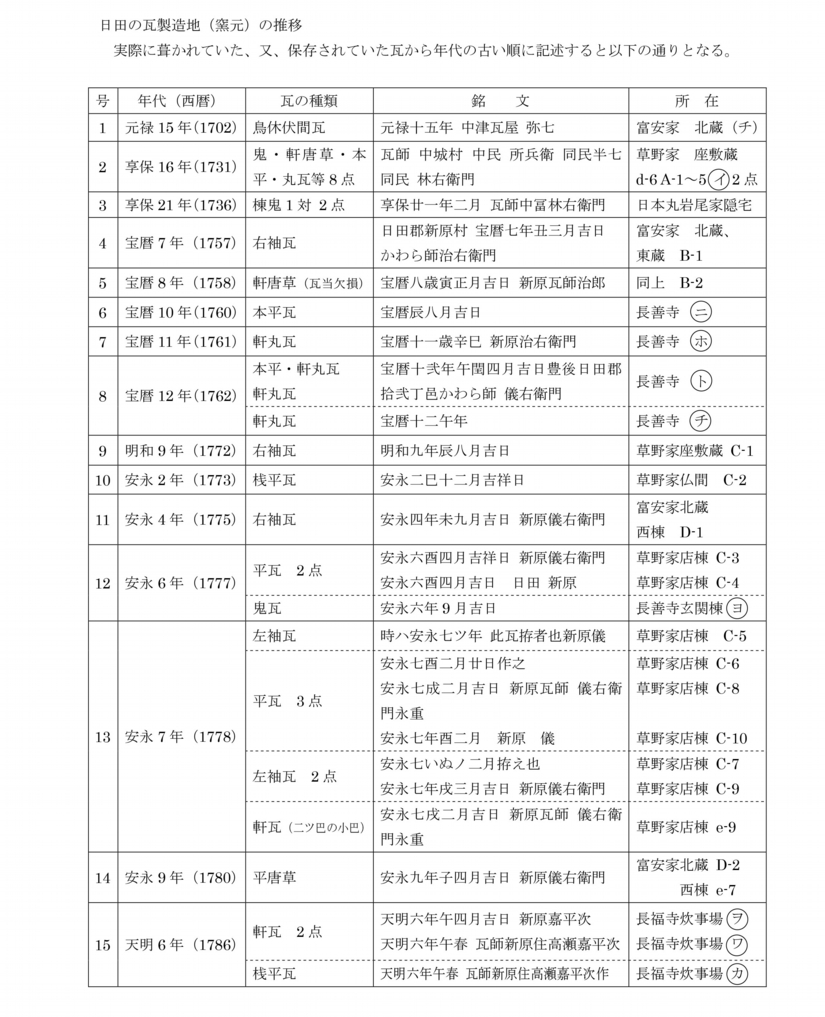 現存する瓦に於いて一番旧い年代は、富安家クンチョウ酒造北蔵に展示されている(チ)「鳥休伏間瓦」で「元禄15年(1702)中津瓦屋 弥七」のヘラ書きがある。クンチョウ北蔵は宝暦7年(1757)上棟と考えられる根拠とした袖瓦・軒唐草瓦(B-1、B-2)が残存している。(チ)の鳥休瓦は北蔵と口伝されるも上棟の55年以前であり、先代の建物の物かもしれないが定かでない。(B-1)と(B-2)の瓦は新原村産である。次に草野家座敷蔵が享保16年(1731)の上棟であり、この時の棟鬼瓦 イ(恵比寿・大黒)他(A-1~5)の丸・本平瓦等が葺かれていた。又、棟鬼瓦 ロ(恵比寿・大黒)は日本丸岩尾家隠宅の鬼瓦として所蔵保存されている。このヘラ書きに「享保21年2月(1736)瓦師 中冨 林右衛門」の銘が見える。形状も一致し、作成年は5年後であり、草野家では瓦師が所兵衛、半七、林右衛門3名であるも岩尾家では末席の林右衛門が1名で作成しているのである。明和9年(1772)5月は豆田一円を焼失する大火が発生する。草野家は享保の瓦葺座敷蔵と茅葺の仏間棟は焼残るも店棟や玄関棟は焼失する。仏間棟を残すことに全勢力を注いだのだろう。店棟から仏間棟への出入口は土戸の防火戸も設置されていた。屋根の茅を抜き捨て、建物を必死で守ったようである。屋根材を遺失してすぐさま明和9年(1772)8月の左袖瓦と安永2年(1773)12月の平瓦(C-1と2)が仏間棟等に葺かれた事がヘラ書きで判る。