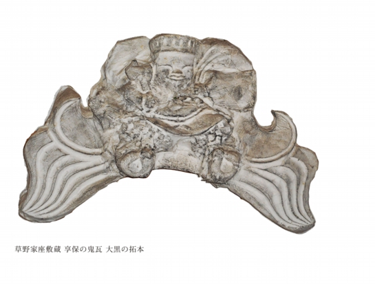 現存する瓦に於いて一番旧い年代は、富安家クンチョウ酒造北蔵に展示されている(チ)「鳥休伏間瓦」で「元禄15年(1702)中津瓦屋 弥七」のヘラ書きがある。クンチョウ北蔵は宝暦7年(1757)上棟と考えられる根拠とした袖瓦・軒唐草瓦(B-1、B-2)が残存している。(チ)の鳥休瓦は北蔵と口伝されるも上棟の55年以前であり、先代の建物の物かもしれないが定かでない。(B-1)と(B-2)の瓦は新原村産である。次に草野家座敷蔵が享保16年(1731)の上棟であり、この時の棟鬼瓦 イ(恵比寿・大黒)他(A-1~5)の丸・本平瓦等が葺かれていた。又、棟鬼瓦 ロ(恵比寿・大黒)は日本丸岩尾家隠宅の鬼瓦として所蔵保存されている。このヘラ書きに「享保21年2月(1736)瓦師 中冨 林右衛門」の銘が見える。形状も一致し、作成年は5年後であり、草野家では瓦師が所兵衛、半七、林右衛門3名であるも岩尾家では末席の林右衛門が1名で作成しているのである。明和9年(1772)5月は豆田一円を焼失する大火が発生する。草野家は享保の瓦葺座敷蔵と茅葺の仏間棟は焼残るも店棟や玄関棟は焼失する。仏間棟を残すことに全勢力を注いだのだろう。店棟から仏間棟への出入口は土戸の防火戸も設置されていた。屋根の茅を抜き捨て、建物を必死で守ったようである。屋根材を遺失してすぐさま明和9年(1772)8月の左袖瓦と安永2年(1773)12月の平瓦(C-1と2)が仏間棟等に葺かれた事がヘラ書きで判る。