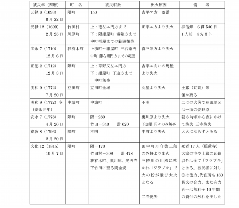 この検証に先立ち、隈・豆田地区の災害(特に火災)について検討する。記録に残るのは隈町の元禄6年(1693)に始まる以下表記の通り。(参照:田中晃著 隈町災害史より)