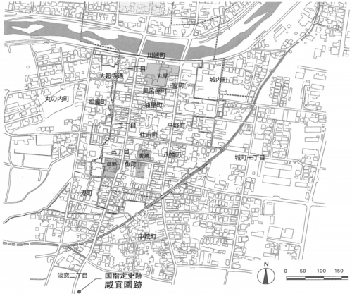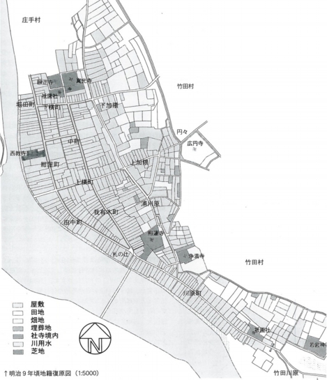 表記の通り、一度火災になると両地区とも川風に煽られて広範囲に数多くの軒数が類焼したことが判る。隈地区では豪商や有力者の居宅及び土蔵等が瓦葺きであり、他の一般家屋はワラブキ屋根が主で類焼範囲も広く、速度も速く燃えたことが判る。特に明治39年の出火元はワラ葺きの建物であり、瓦葺きが普及しだしているがワラ葺屋根が残っている(ワラブキと記載あるも、茅葺であったであろう)。豆田地区に於いても同様である。明和の火災時の草野家でも仏間棟は茅葺きであり、土蔵類が瓦葺きであった。この火災の翌年から安永年間にかけて新原瓦が大量に出回る。豆田の惨状から火災に強い居蔵造りの建物へと発展していく。明治末頃でも茅葺屋根は残るものの、ほぼ瓦葺になったと言える。つまり徐々にであるが、建物は瓦葺きへと葺き替えの進行が見られる。現在でも茅葺きや杉皮葺きの家屋が、隈で2棟、茅葺きにトタン貼り家屋も隈・豆田合わせて数棟。周辺部に行くと相当数望見できる(家並みが疎らであり火災が起きても単一となり、類焼が少ないことと、気候風土からも住み良いことがあるのであろう・・・居蔵造りを除けば叉首造りは小屋裏の空気層で外部との冷気・暖気が遮断され、室内温度は一定される)。
