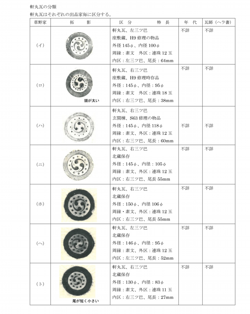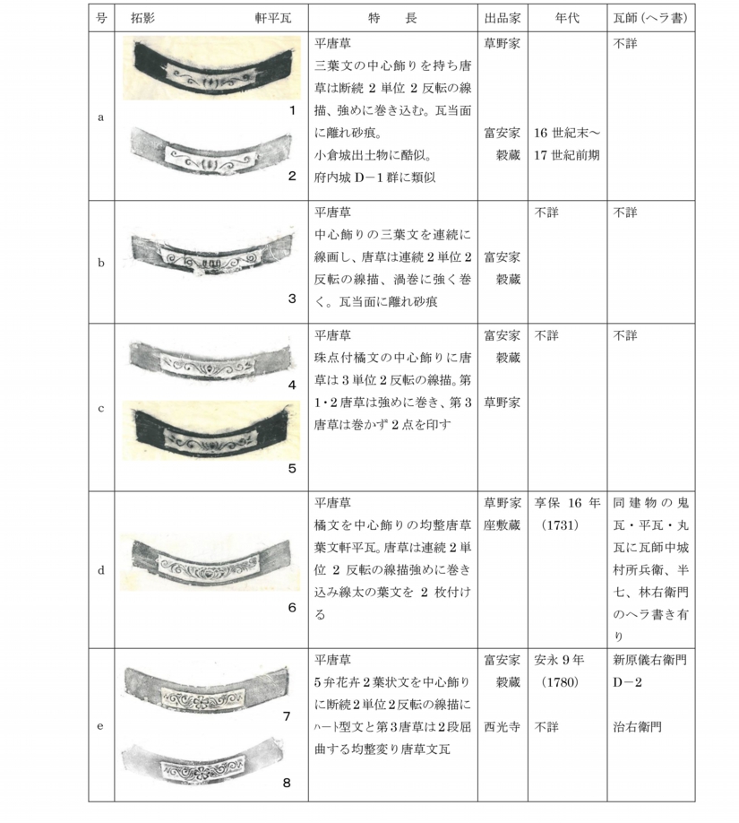 ここでは軒平瓦のうち、本葺型牝瓦を平唐草瓦、桟瓦葺型を唐草瓦と呼ぶが、昨今は一般に軒瓦と呼ばれるので軒瓦と区分表示する。また、軒丸瓦(巴瓦)と平唐草瓦のセット関係は多岐に渡り、それぞれの分類で検討した。
