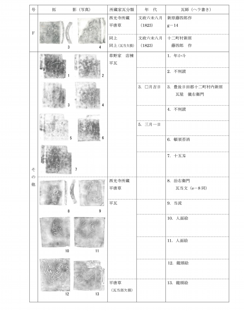 文政年間では「文政2年(1819)新原藤四郎作」の広円寺山門に葺かれていた鳥休瓦を始め、軒丸瓦4点も存品で連珠は7玉、12玉、15玉で尾長は60mmと同じ長さである。(広円寺 ソ・ツ・ネ・ナ)その外、西教寺本堂に存する左右鬼面瓦に「文政3年(1820)新原住高瀬氏藤四郎永重」(F-1、2)のヘラ書きが見える。富安家に於いては北蔵に保存の鳥休瓦がある「文政元年(1818)新原藤四郎作」(リ)と、穀蔵平唐草(g-13)「文政8年(1825)新原藤四郎」のヘラ書き、西光寺の平唐草(g-14)も「文政6年(1823)新原藤四郎作」とあり、瓦当文は「中心飾り半菊花卉状文 均整唐草波状文」と同一である。また(F-3、4)も「文政6年(1823)十二町村新原藤四郎作」と同じ瓦師である。
