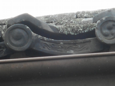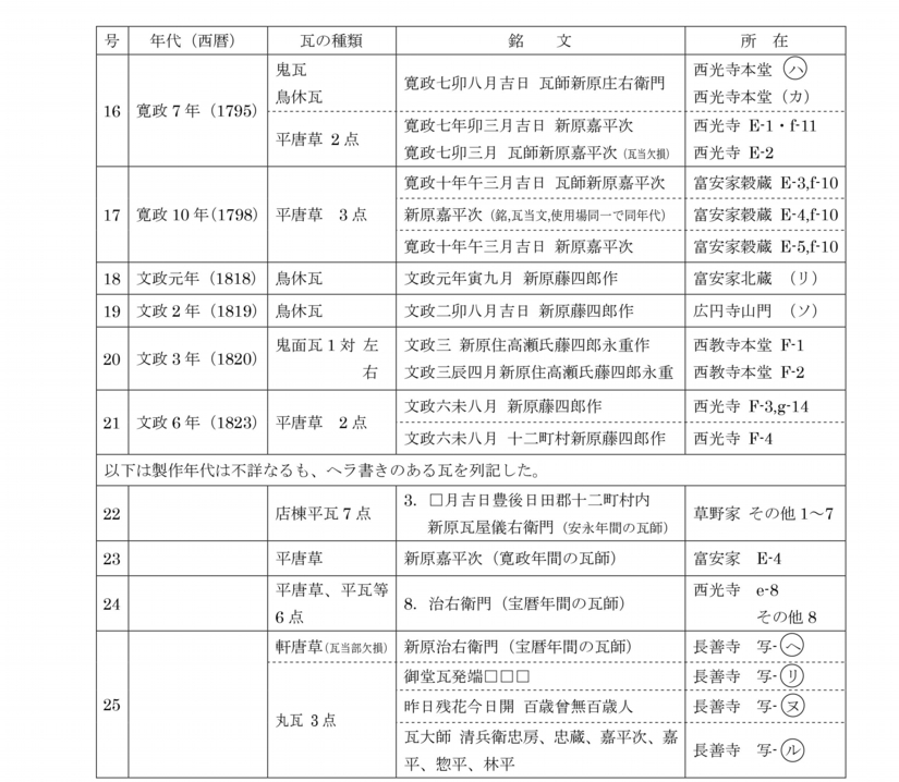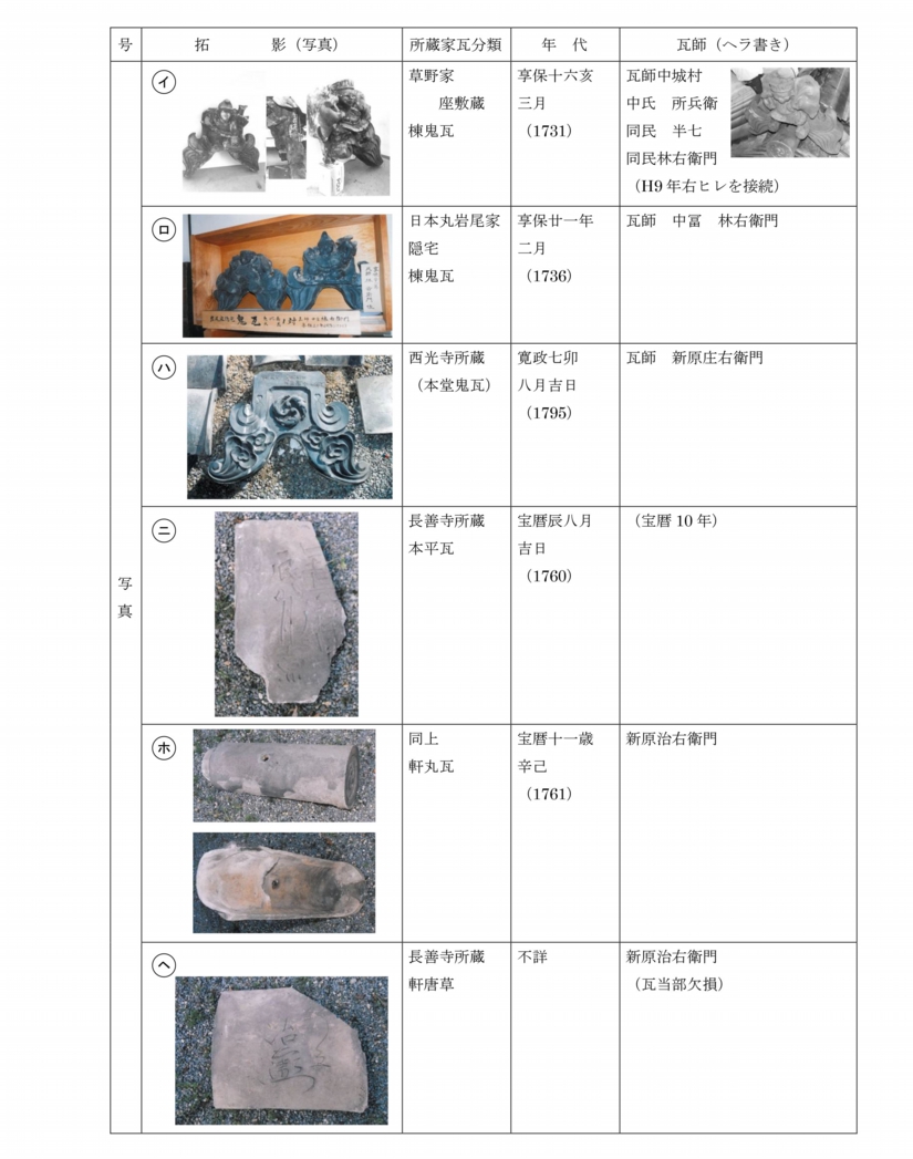 長福寺玄関棟の鬼瓦(写真 ヨ )は「安永6年(1777)日田郡十二町邑 瓦師儀右衛門」のヘラ書き、他に炊事場棟の軒瓦、桟平瓦等(写真 ヲ ・ ワ ・ カ )には「天明6年(1786)新原嘉平次 ヲ 、瓦師 新原住高瀬嘉平次」のヘラ書きの瓦が葺かれていた。