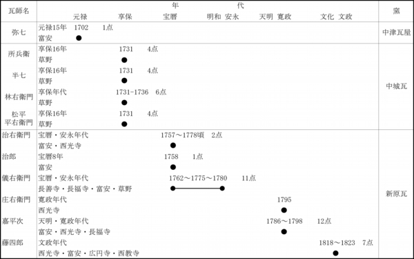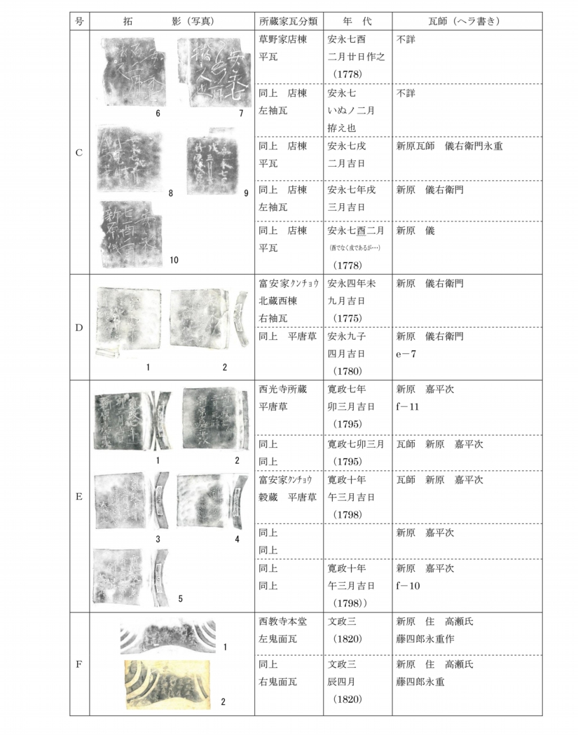 寛政年間に入ると、西光寺所蔵の平唐草(f-11(E-1)、E-2)鳥休伏間(カ)が「寛政7年(1795)」作で、富安家クンチョウ酒造の穀蔵平唐草(f-10、E-3、4、5)、軒丸瓦(ヌ)は「寛政10年(1798)」であるが、瓦師はいづれも「新原嘉平次」である。
