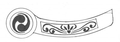 内区の押型は木瓜文型に造り(n-24,25,26)は葺幅 255 型であり、中心飾りは珠点付半菊花卉状文 で唐草は蔓がゆるやかに伸び 2 反転の葉文(もしくは枝分かれ)を付けるも 3 点共葉文の位置が微妙に 異なる。又、(n-27,28)は葺幅 235 型であり、瓦当文も(n-27)が三ツ巴連珠 15 玉の小巴を付け、 中心飾りは五弁花卉状文の中心飾りに蔓がゆるやかに伸び上下 2 反転の葉文(もしくは枝分かれ)を付 けるも前記 3 点とは位置が異なる。また(n-28)は梅鉢文の小巴を付け、中心飾りは桃実文様に均整 の立浪文であり、桃太郎童話の絵柄を模したか、桃の精は悪霊を退散させる故事からかとも思えるし、 仙果としての効用、中国の西王母伝承の仙女から不老長寿を願う不損の建物と考えたのであろうか。
